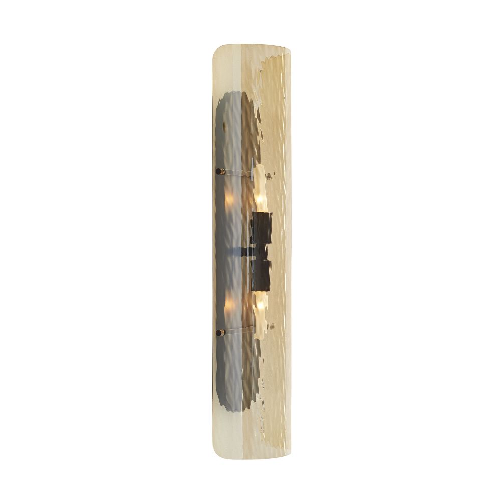 The Bend sconce casts dynamic, directional patterned light through a long, narrow half-cylinder of rippled glass. A celebration of the subtle variations of hand-blown glass, Bend's textural amber glass floating shade encases a modern, pill-shaped blackened steel plate, creating a bold interplay of materials and forms that make it an ideal choice for corridors and vanities. Certified for damp locations and intended for interior use.